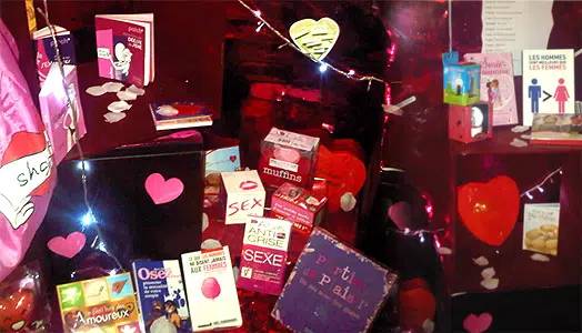 Je commence par une vision qui m’a provoquée un décrochement de la mâchoire. Un Virgin mégastore a installé une belle vitrine aux tons chauds et velours avec des coeurs. Jusqu’ici, RAS.