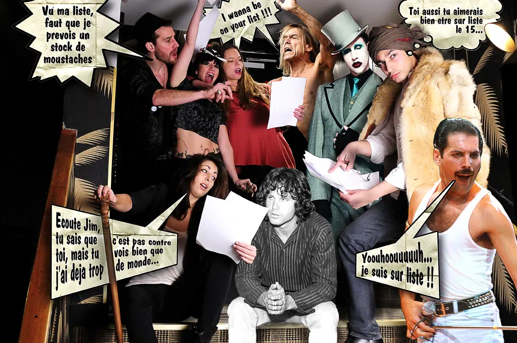 Ma cuisse droite s’est anormalement amaigrie 20 minutes avant d’arriver aux portes du Bus… (Je vois pas d’autres explications…). Et donc, ça donne une nana, qui glisse subtilement sa main entre ses cuisses – que ce soit dans le métro ou dans la rue – pour remonter sauvagement un bas qui avait la sale manie de glisser. C’était soit ça, soit je lançais bien malgré moi une nouvelle mode de bas avachis sur les chevilles. Et comme je « n’y comprends rien à la mode », j’aurais été taxée de fille de bien mauvais goût. Autant passer pour une coquine, quoi… Bien sûr, j’aurais pu aller aux toilettes réajuster tout ça et on en parlait plus, mais avant de pouvoir le faire, je tombe sur mon grand ami François Capdeville, qui me présente à ses amis, et ainsi de suite et là… y a plus qu’à espérer que personne n’ait pas vu le va-et-vient de votre main. Bref, j’ai commencé la soirée l’air coincé, les jambes serrées, évitant de bouger… pas terrible lorsqu’on est invitée à la pré-soirée réservée aux amis, happy few et autre people, où vous croisez les Naive New Beaters, Louis Bertignac, Daphné Bürki, Amen Birdmen, Yann Destal (Ex Modjo), Les Airnadettes… Le moment était mal choisi pour se balader avec un bas résille sur les talons. Puis au moment où le showcase du groupe 3somesisters débutait, j’ai pu me faufiler dans les toilettes… et ensuite ENFIN me mouvoir et profiter du buffet, tout en me gorgeant de bulles de champagne dans une ambiance glam’ rock…