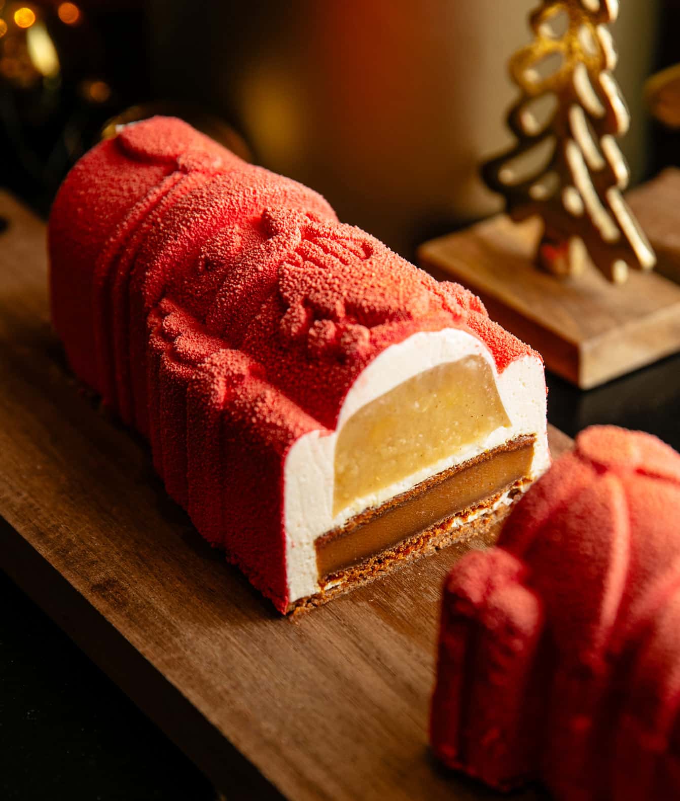 La bûche Casse-Noisette (65 € pour 8 pers.), mêlant pain d’épice, poire et mousse au miel, est disponible sur commande ou à déguster sur place.
