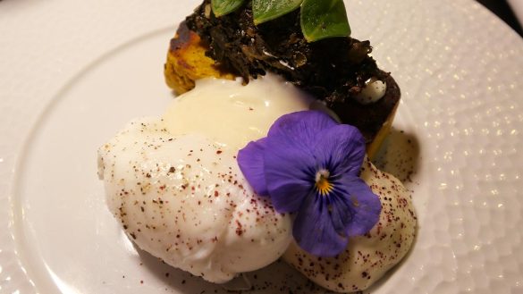 Voile betterave, ricotta, glace olive, émulsion feta, crumble cumin et charbon / LA COQUILLE DE COMPOSTELLE – Saint-Jacques, foie gras poêlé, orange, fleur d’oranger, noix de pécan / ART FLORENTIN(E) -Brioche au hawaidje, ghormeh Sabzi, sauce Mornay au halloumi, œuf poché