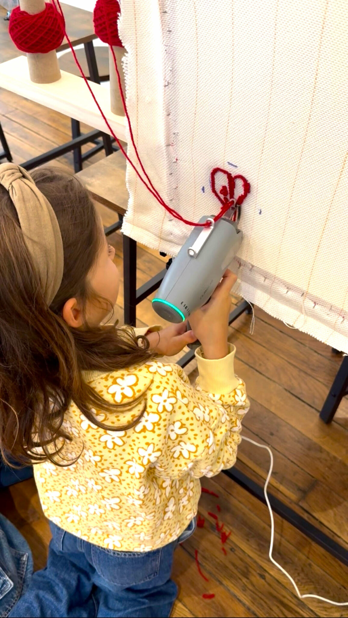 Apartir de 7 ans, le tufting est accessible aux enfants grâce à des pistolets légers. Mais ils doivent être accompagnés de 7 à 12 ans.