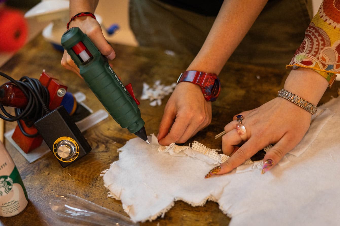 Place ensuite à la prise en main du fameux outil. On apprend à utiliser un pistolet à tufting, à maîtriser la pression, la vitesse et le geste, avec quelques essais directement sur la toile. Sous l’œil attentif des artistes tufters, les premiers points se font rapidement rassurants.