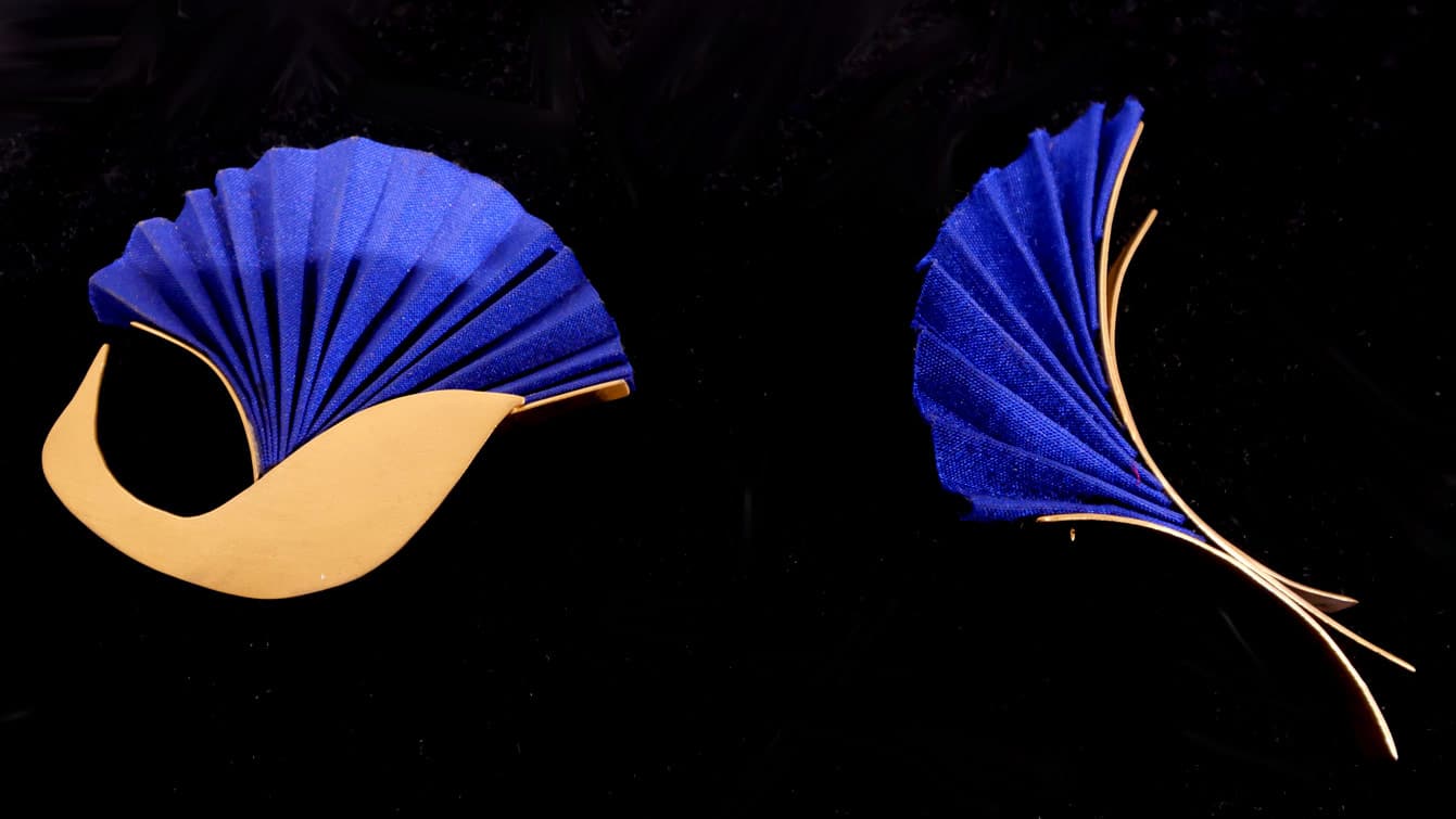 Boucles d’oreiles éventail à paillettes, Katerina Makriyiann (bronze, argent 925, vermeil, or 24 carats, soie.) – Crédit photo ©Glose