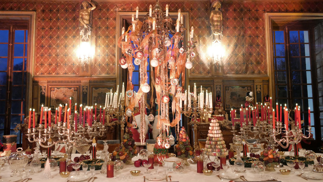 Dans la grande salle à manger, la table du réveillon est dressée comme dans un conte : vaisselle, pièces montées factices, chandeliers, bougies rouges, guirlandes et ambiance de banquet royal. La décoration est d’une richesse extrême qui frise la surenchère, mais quoi de plus adapté que noël pour laisser libre cours à une telle fantaisie ?