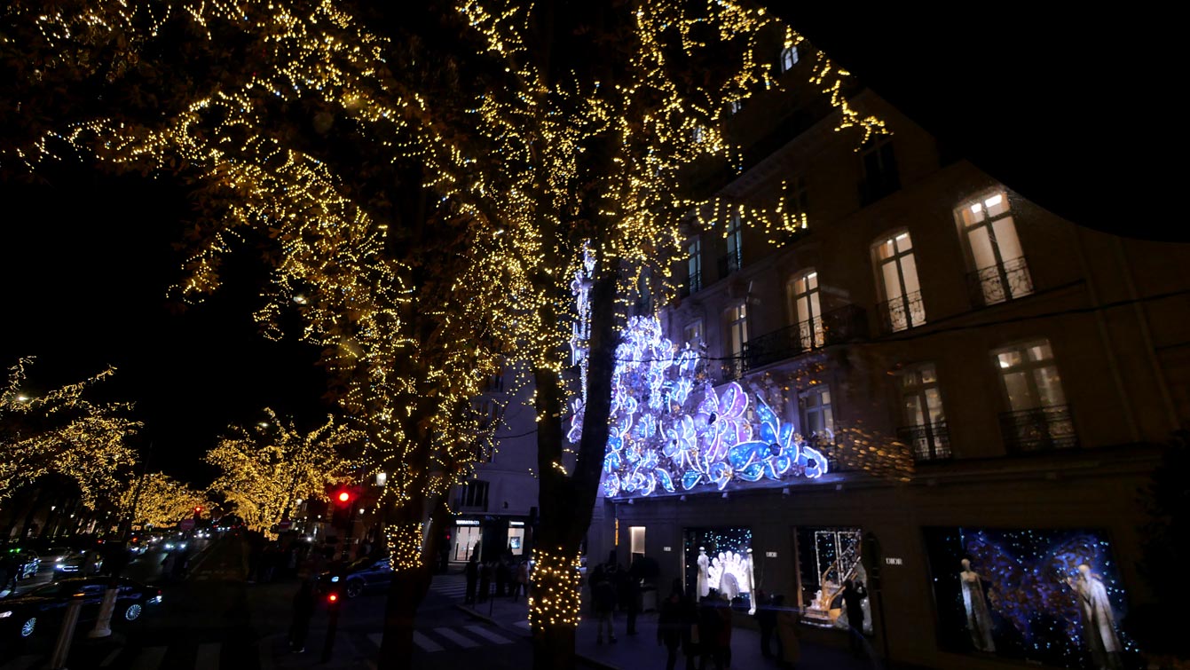 L’arrivée sur les Champs-Élysées. Le bus s’engage dans l’avenue telle une barque dans un fleuve de lumière. C’est beau, c’est grandiose. Sans oublier la célèbre avenue Montaigne, connue pour ses belles devantures. Les arbres de l’avenue sont entièrement recouverts de guirlandes lumineuses. Chaque année, Dior se distingue avec une nouvelle décoration. En 2025, la marque de luxe a choisi une étoile entourée de fleurs.